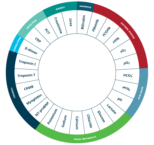 Visión global de algunos de los parámetros relevantes que puede medir con la solución de Radiometer para POCT en la UCI. Los parámetros y biomarcadores de la solución de Radiometer para POCT en la UCI se incluyen en varios sistemas de puntuación de evaluación de salud como APACHE, MODS, SAPS, y LODS [2].