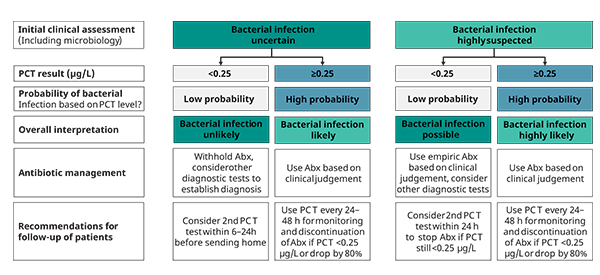 Un documento de consenso reciente de Schuetz et al. ofrece recomendaciones sobre el manejo con antibióticos de pacientes de Urgencias y UCI basado en la gravedad clínica, la probabilidad de infección bacteriana y los niveles de PCT. Ver figuras 1 - 3 [1].